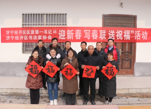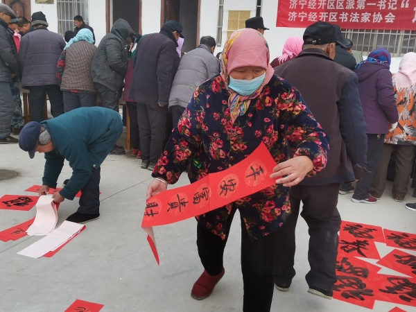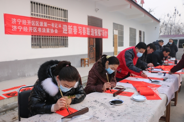 随着虎年春节的临近,1月26日,济宁经开区马集镇下花林村区派第一书记黄翠贤邀请区书法家协会,联手村里书法爱好者,开展“迎新春写春联送祝福”活动,10多位书法家现场挥毫洒墨,把祝福融入笔尖,为村民送上了诚挚的祝福,同时,第一书记也将人社政策和禁放烟花爆竹的通知宣传到每一位村民。