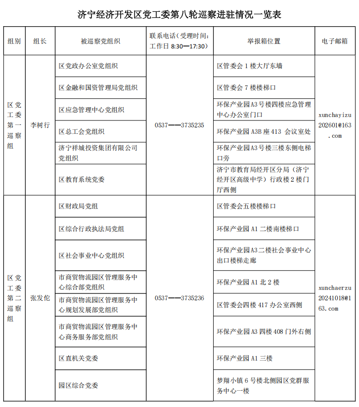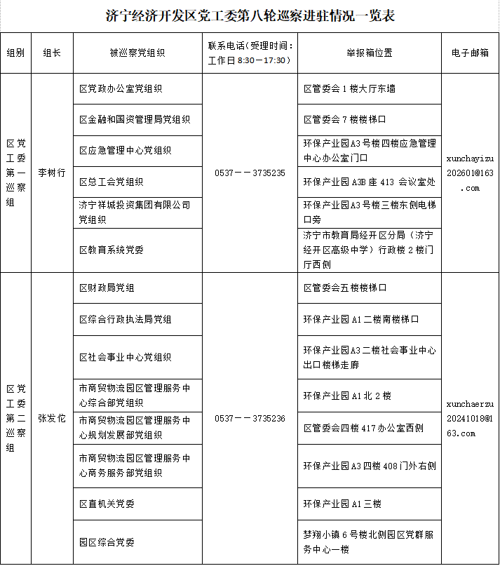 根据区党工委统一部署,截至1月15日,区党工委第八轮巡察完成进驻工作。2个巡察组分别对区党政办公室、区财政局、区金融和国资管理局、区综合行政执法局、区社会事业中心、区应急管理中心、市商贸物流园区管理服务中心综合部、市商贸物流园区管理服务中心规划发展部、市商贸物流园区管理服务中心商务服务部、区总工会党组织,区直机关党委、园区综合党委、区教育系统党委和济宁祥城投资集团有限公司党组织开展常规巡察。