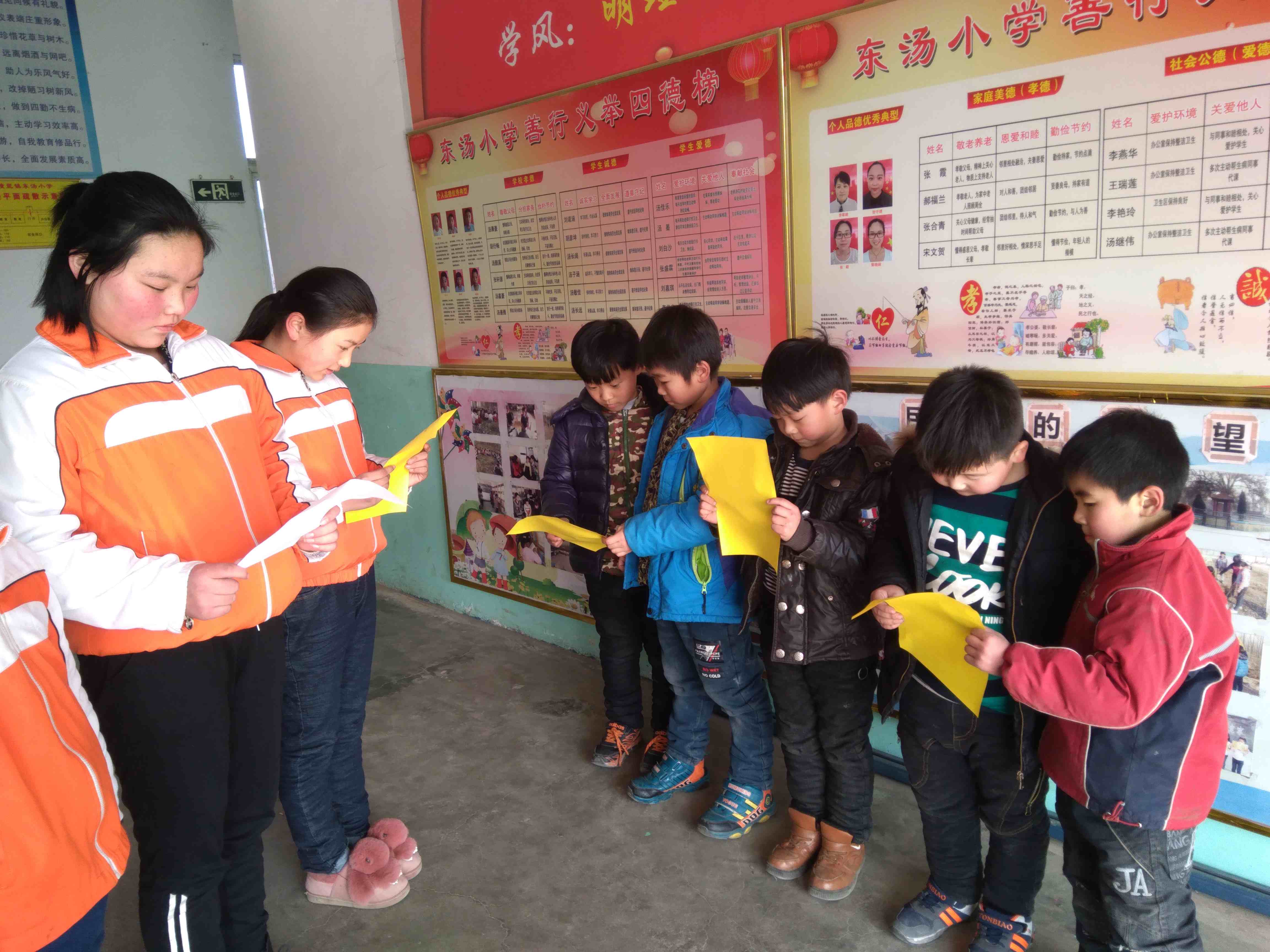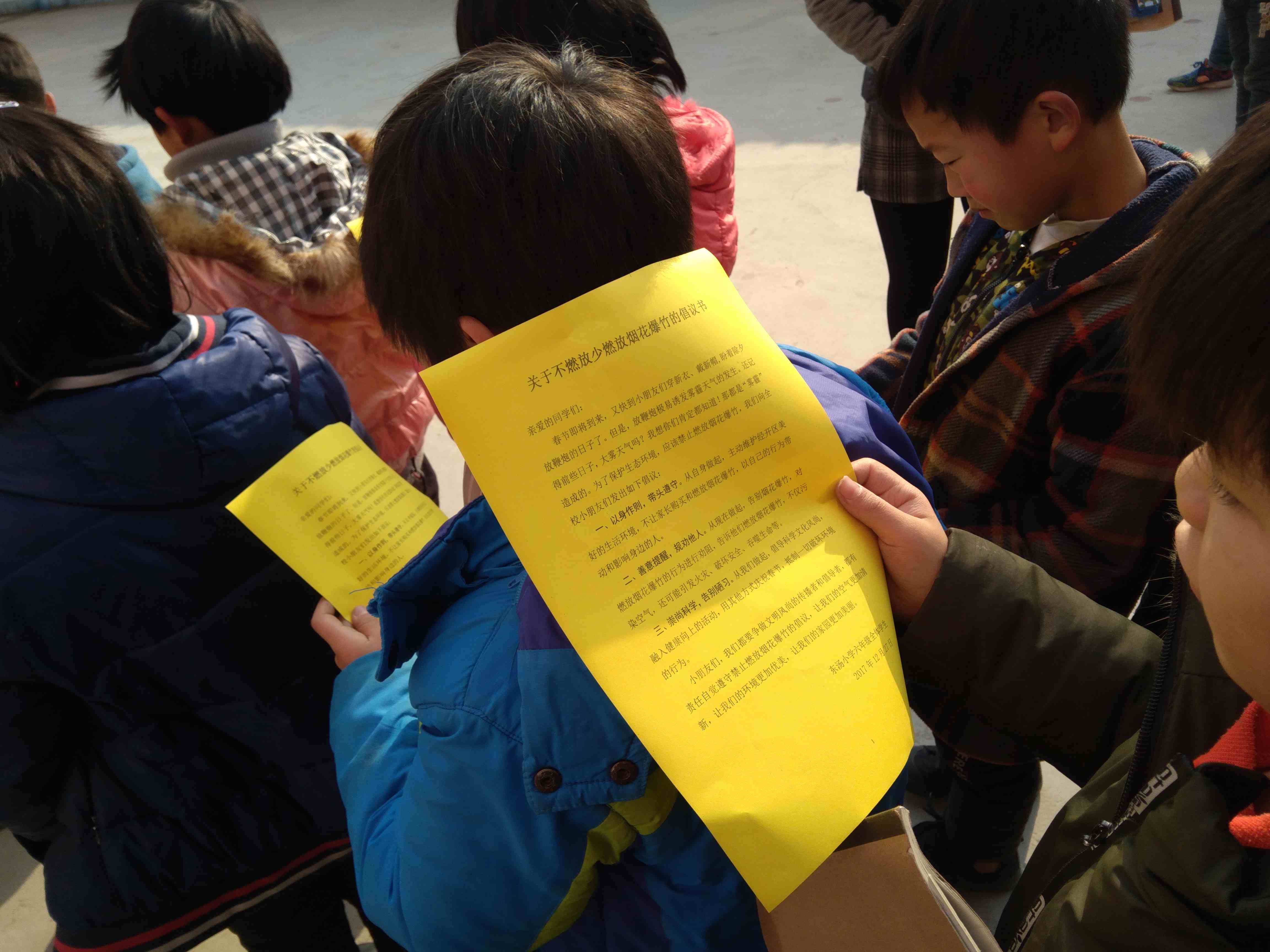 为使全体师生过一个低碳、健康、欢乐的春节,12月27日东汤小学开展了“小手拉大手,环保过年我先行”倡议活动。倡导全校师生自觉做少购买少燃放烟花爆竹的先行者, 做少购买少燃放烟花爆竹的宣传者。宣传了有关宣传燃放烟花爆竹的危害性,引导学生动员家长和身边的亲朋好友与时俱进、文明过节,力争过一个“没有爆竹的欢乐中国年”。