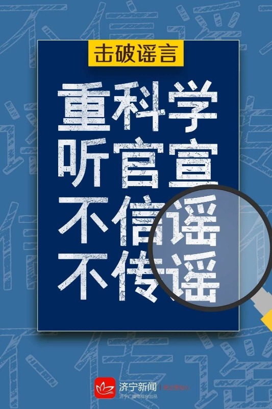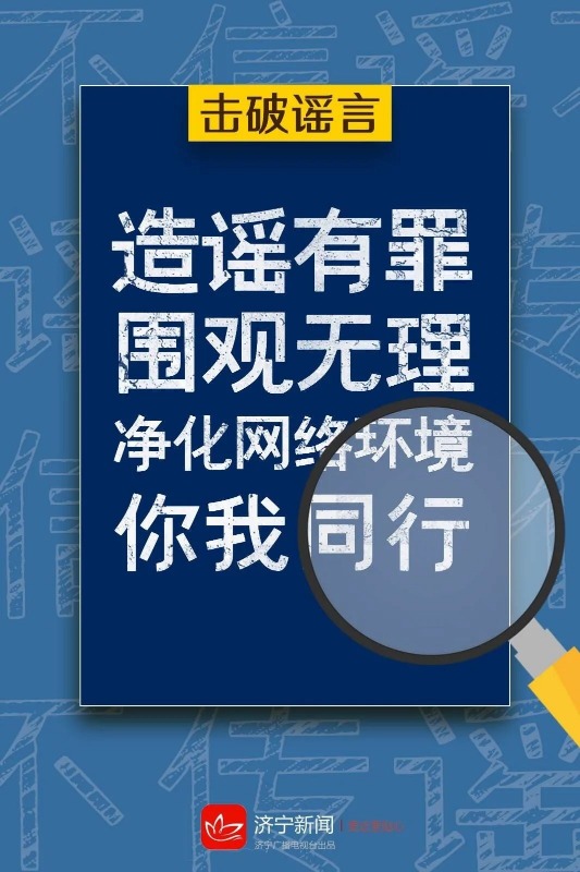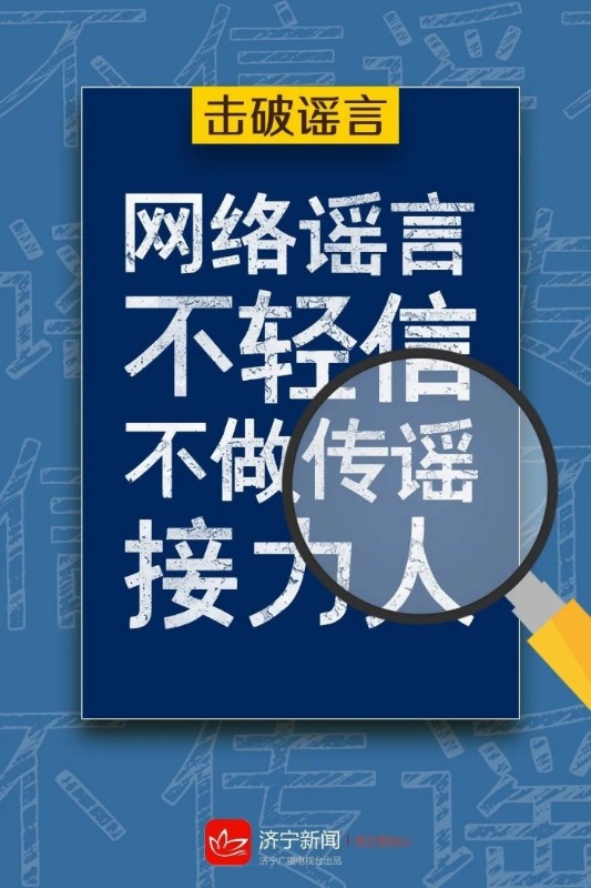 济宁市全媒体辟谣平台讯 对于网络信息,大众要仔细辨别、认真判断,对未经证实的消息以及指向不明的信息应当理性对待,不做空穴来风、无中生有的臆测、推想,不轻信、不盲从、不哗众取宠,不随意传播非官方渠道的信息,自觉抵制网络谣言,不信谣不传谣,争做网络文明的传播者,共同推进网络诚信建设,携手维护清朗网络空间。