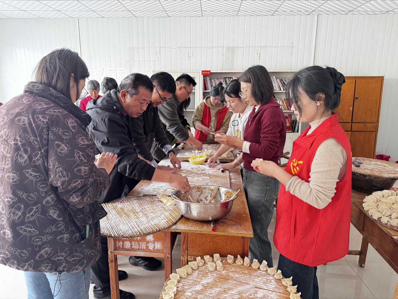 清晨 8 点多,疃里镇龙桥村村委会活动大厅已热闹起来。党员干部、网格员志愿者与村内阿姨们齐动手,和面、调馅、擀皮、包饺子,分工明确又默契十足,指尖翻飞间,一个个饱满的饺子渐渐堆成小山。